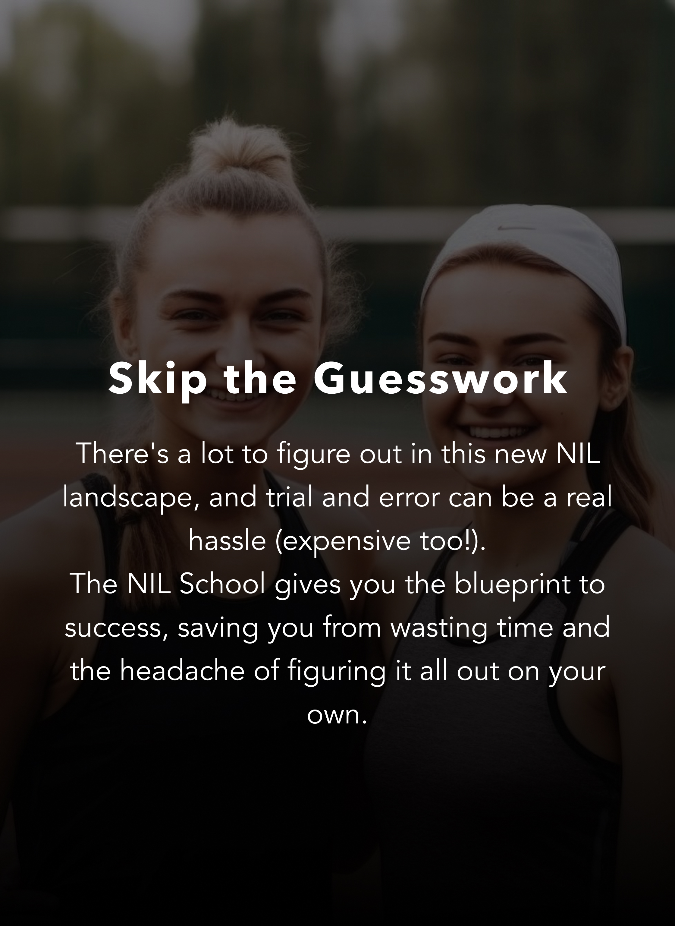 You've spent years training and have sacrificed so much to become the incredible athlete you are today. Now it's time to capitalize on that and leverage your likeness to build success beyond your sport. Our signature NIL coaching program, The NIL School, offers two options: a do-it-yourself digital course where you can go at your own pace, or private 1-on-1 coaching with Stephanie (females only).