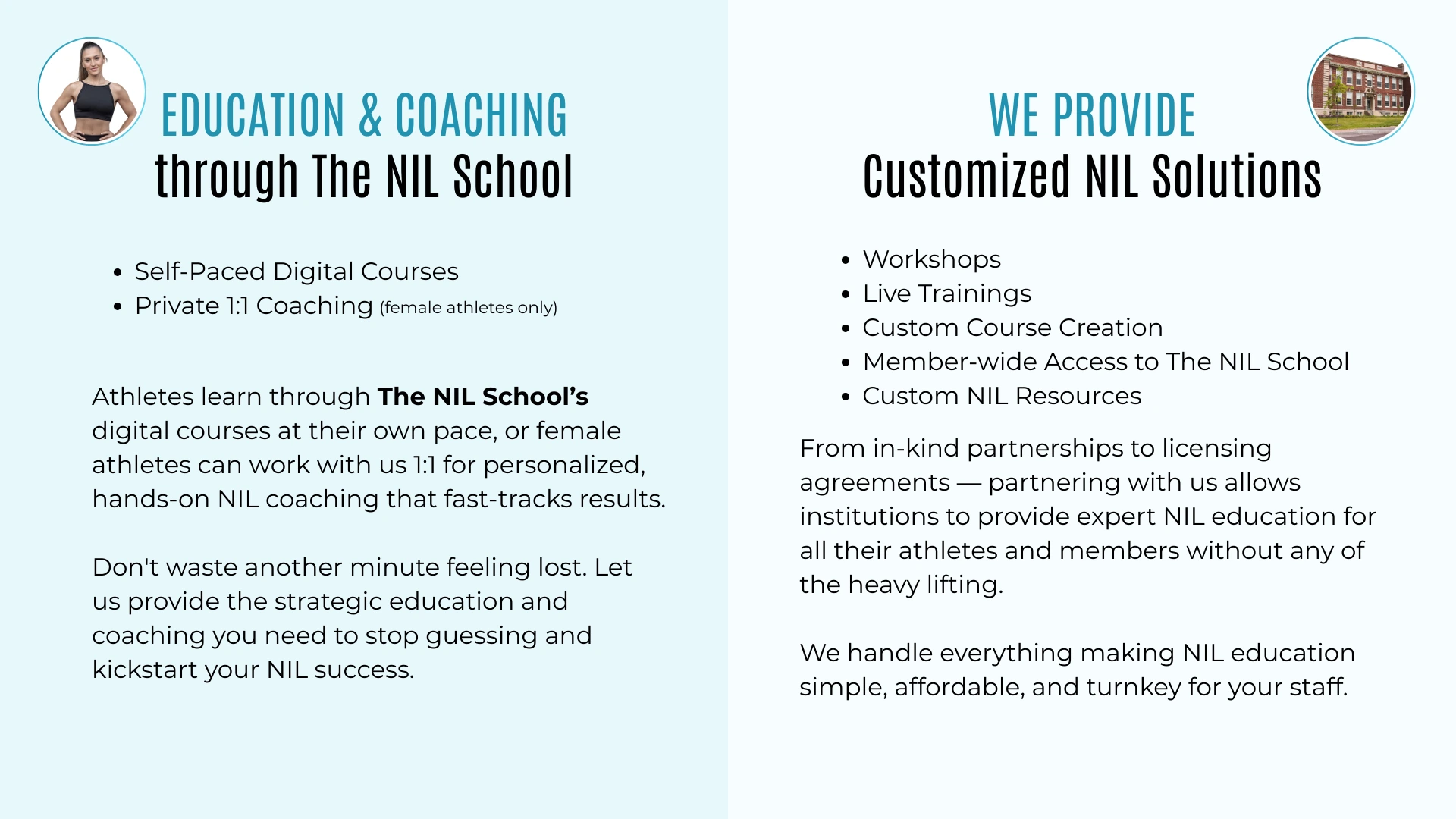 Our signature NIL coaching programs inside The NIL School and our bespoke institutional partnerships are tailored specifically for all stakeholders to learn how to capitalize on NIL safely and successfully.