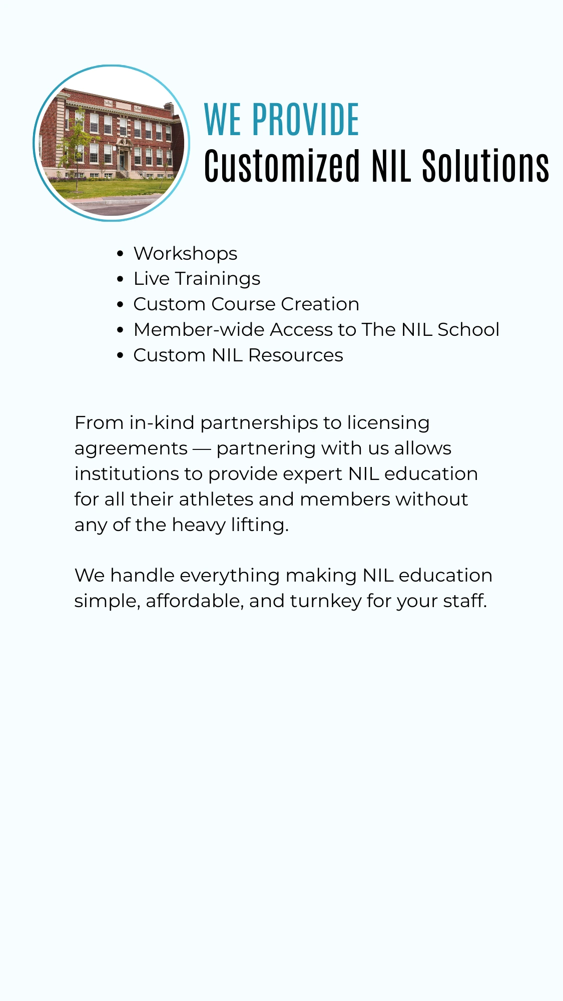 We make NIL education effortless and impactful for your athletes — and easy on your staff. From live workshops and ready-to-use NIL resources to a scalable licensing option for bulk NIL School access, we offer unmatched value and flexibility.
